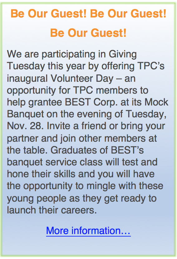 At last year’s annual meeting, President Susan Benford announced that in recognition of Marla Felcher’s tireless efforts to bring TPC into being and nurture it through its early years, TPC’s Board pledged funds to establish the Marla Felcher Young Philanthropist (YP) Award. Each year, Marla will select a young woman who will receive a sponsored membership to TPC. We are very pleased to announce that Marla has chosen the first Felcher YP, Laura Botero. It is hard to imagine a more impressive and accomplished young woman. (Read more…)
